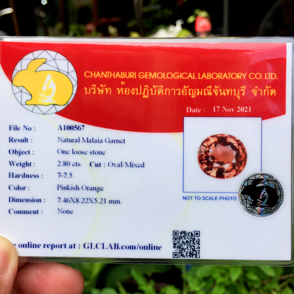 ฟรีใบเซอร์ 2.80กะรัตพลอยมาลายาการ์เน็ท ดิบ ท้อปเกรด (Malaia Garnet) ไม่อบไม่เผา สีส้มประกายชมพู (เป็นสีธรรมชาติ) ไฟดีเต็มเม็ด พลอยสะอาดมาก